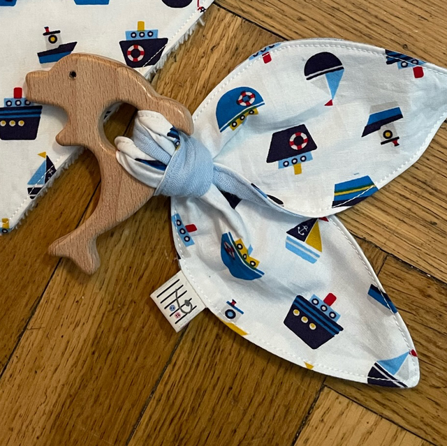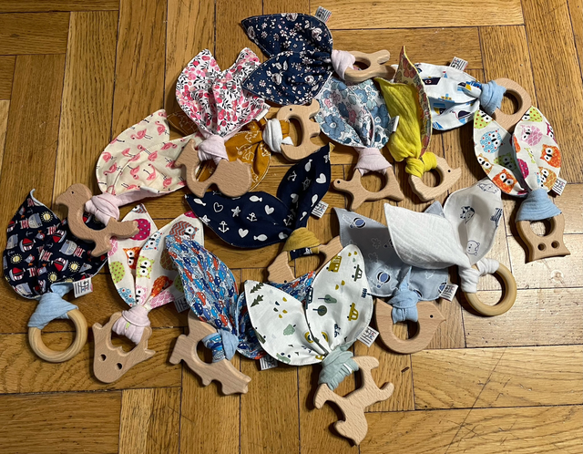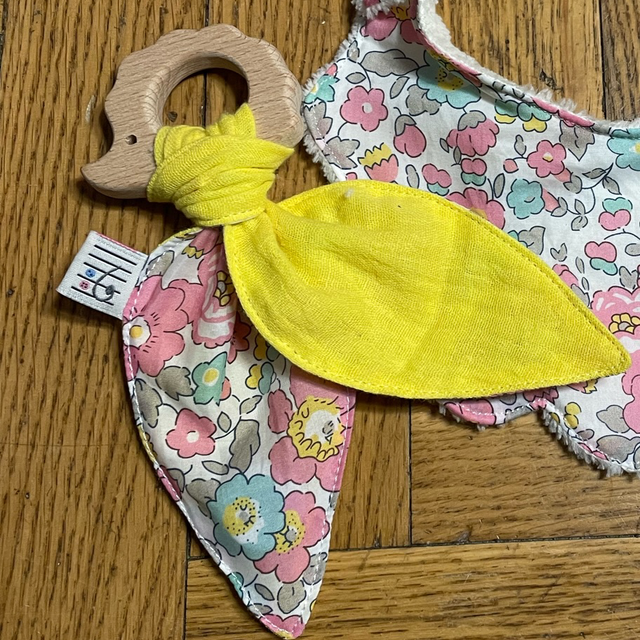 Ce petit hochet avec anneau de dentition en bois et des oreilles en double gaze et coton sera un ami fidèle de votre bébé. C’est aussi un cadeau de naissance idéal. Il peut être avec ou sans grelot.