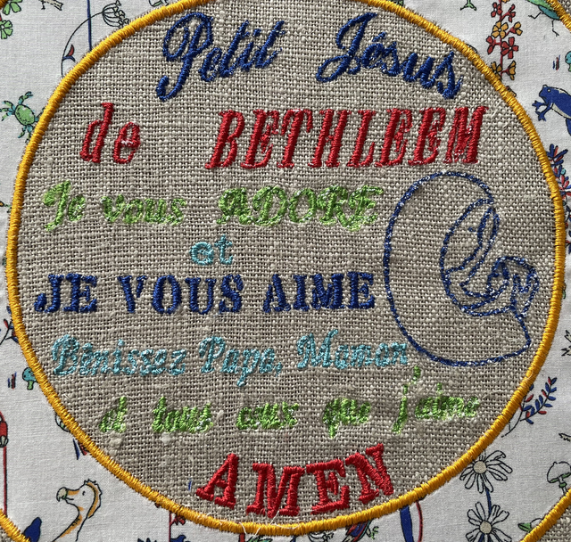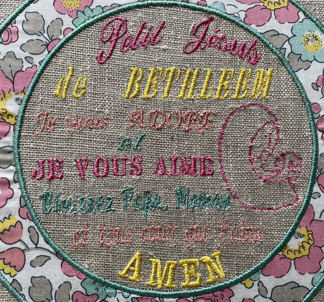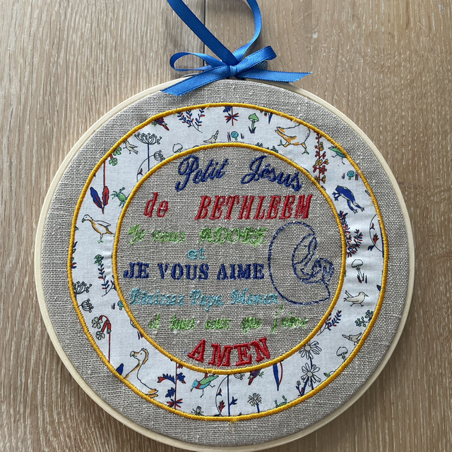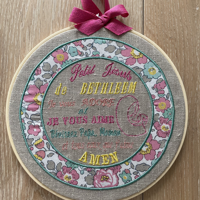 Cadre 20cm de diamètre avec la jolie prière « Petit Jésus de Bethléem » brodée sur du lin.